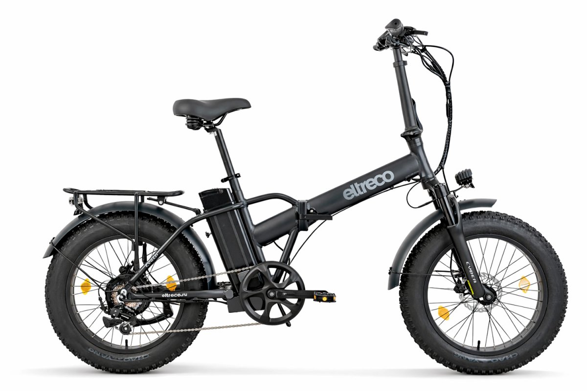 Электровелосипед Eltreco CYBER PRO — компактный складной фэтбайк. Редукторный мотор 500 Вт на 48 В с Li-Ion 15 Ah быстросъемной батареей обеспечивает пробег до 60 км. Колеса 20-4.00", складная алюминиевая рама. Гидравлические дисковые тормоза 160 мм, 7 скоростей Shimano Altus. Комплект: багажник, крылья, фара, фонарь. Габариты 1010×450×730 мм.