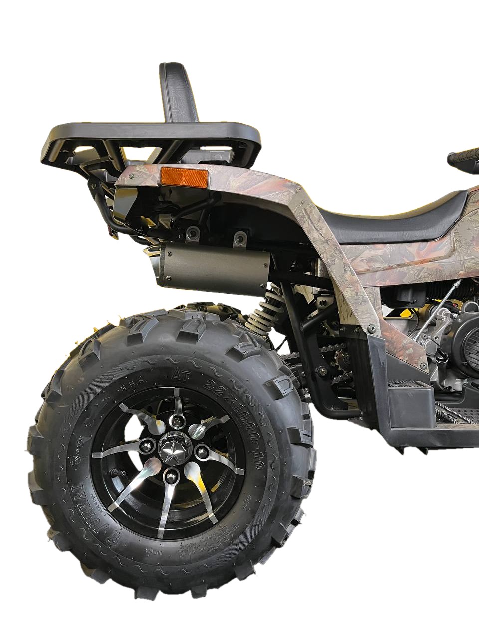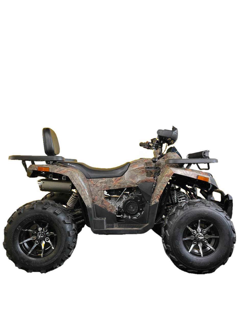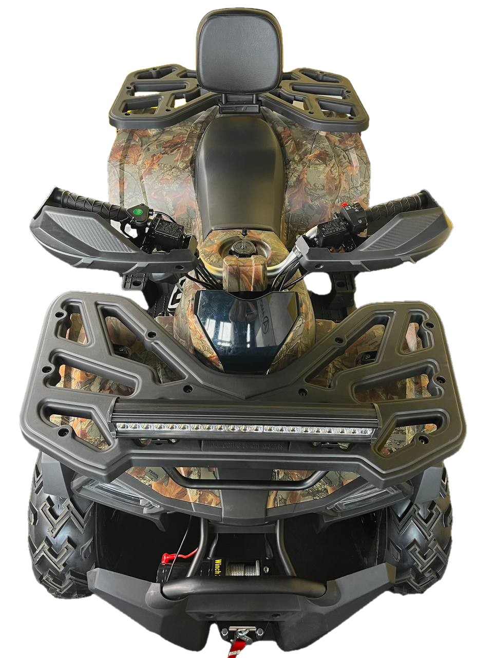 Трансмиссия и ходовая часть квадроцикла представлена прочными разноразмерными шинами, металлическими литыми колесными дисками, автоматической трансмиссией с реверсом. Модель имеет крупный размер, удобное посадочное место, высокий дорожный просвет (320 мм) и чувствительную тормозную систему. В комплекте идет система автозапуска с дистанционным контролем, которая позволяет завести, заглушить квадроцикл на расстоянии 100 метров. А так же имеется ограничитель скорости, расположенный с правой стороны руля. Стоит принять во внимание и наличие таких опций как: защита рук, удобная широкая и закрытая площадка для ног, расширители колесных арок, передний отбойник, гнездо прикуривателя, спидометр, передние и задние поворотники.