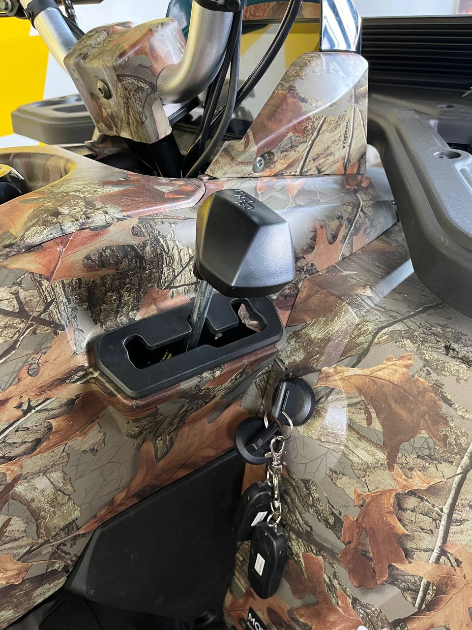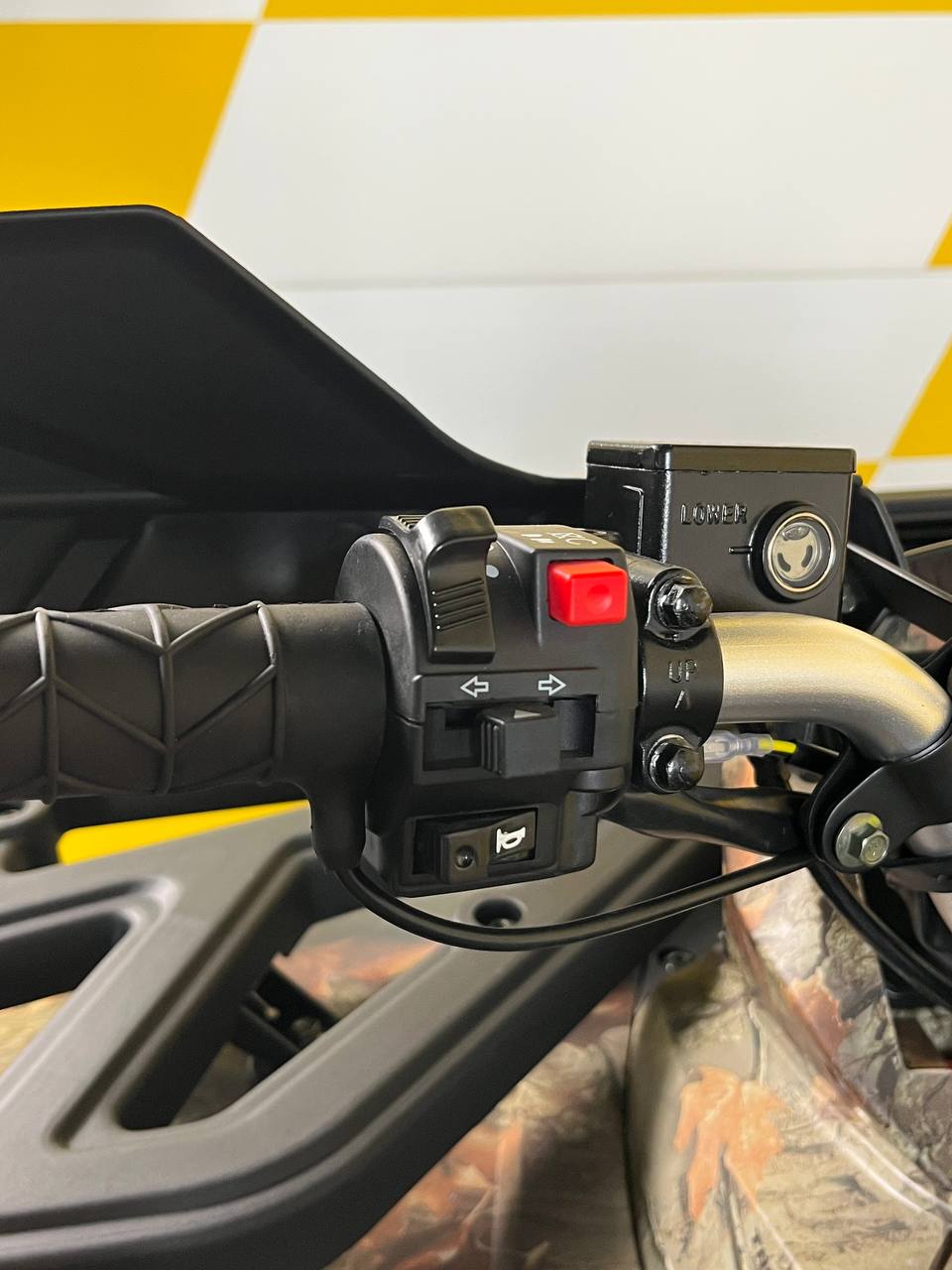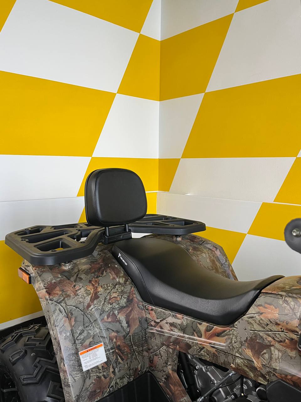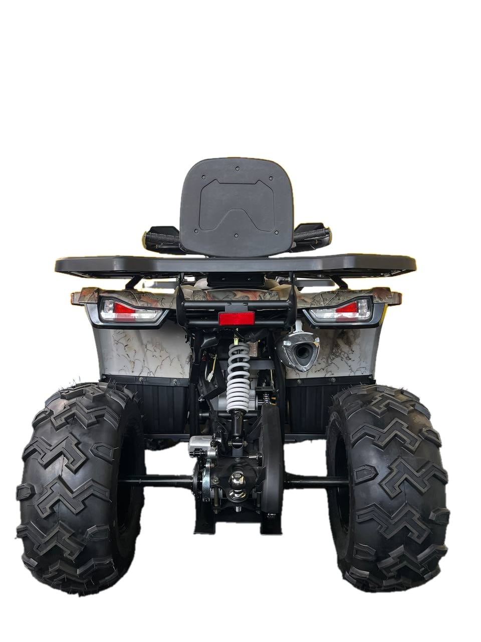 Трансмиссия и ходовая часть квадроцикла представлена прочными разноразмерными шинами, металлическими литыми колесными дисками, автоматической трансмиссией с реверсом. Модель имеет крупный размер, удобное посадочное место, высокий дорожный просвет (320 мм) и чувствительную тормозную систему. В комплекте идет система автозапуска с дистанционным контролем, которая позволяет завести, заглушить квадроцикл на расстоянии 100 метров. А так же имеется ограничитель скорости, расположенный с правой стороны руля. Стоит принять во внимание и наличие таких опций как: защита рук, удобная широкая и закрытая площадка для ног, расширители колесных арок, передний отбойник, гнездо прикуривателя, спидометр, передние и задние поворотники.