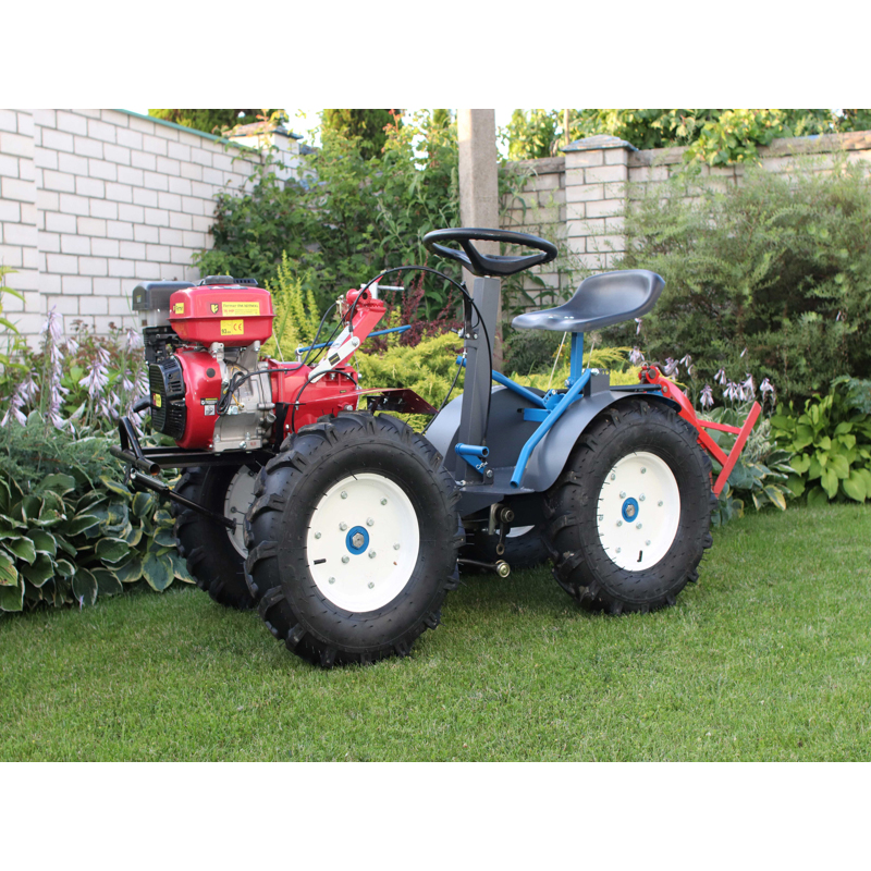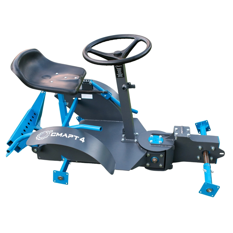 Рама выполнена из листового металла толщиной 4 мм с усиленными узлами на конических подшипниках. Крутящий момент передается через две усиленные цепи, а поворот осуществляется рулевым редуктором с тягой на шаровых шарнирах. Фрикционный тормоз с ручным приводом обеспечивает надежную остановку. Сиденье анатомической формы из стеклопластика делает работу комфортной, а окраска высококачественной автомобильной краской защищает адаптер от внешних воздействий.