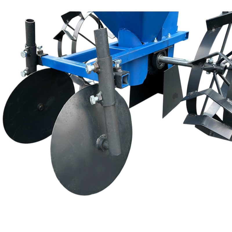 Бункер объемом 39 кг позволяет загружать достаточное количество картофеля для продолжительной работы без частой дозагрузки. Ширина междурядья регулируется от 51 до 60 см, а глубина обработки варьируется от 5 до 18 см, что обеспечивает универсальность при посадке на различных почвах. Расстояние между клубнями можно настроить на 22 или 27 см, поэтому посадка получается оптимально организована.