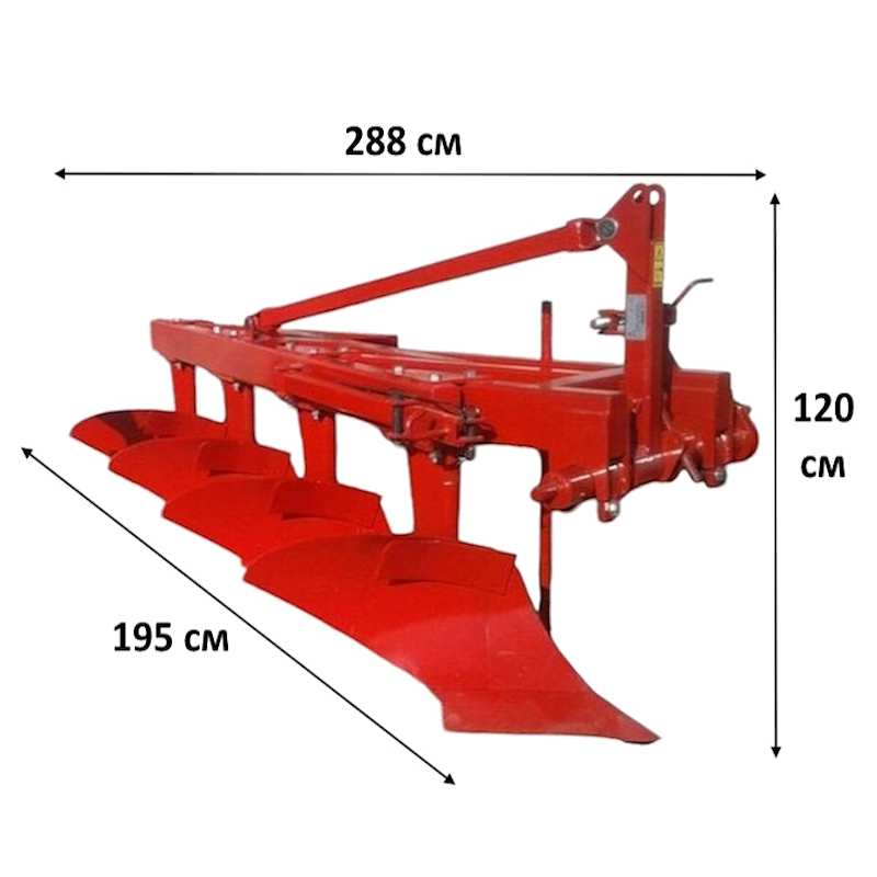 Габариты плуга составляют 288 см в длину, 195 см в ширину и 120 см в высоту, а его вес — 430 кг, что обеспечивает стабильную работу и отличную проходимость на разных участках. Прочная конструкция и высококачественные материалы делают его долговечным и устойчивым к нагрузкам, что особенно важно при работе на сложных почвах.
