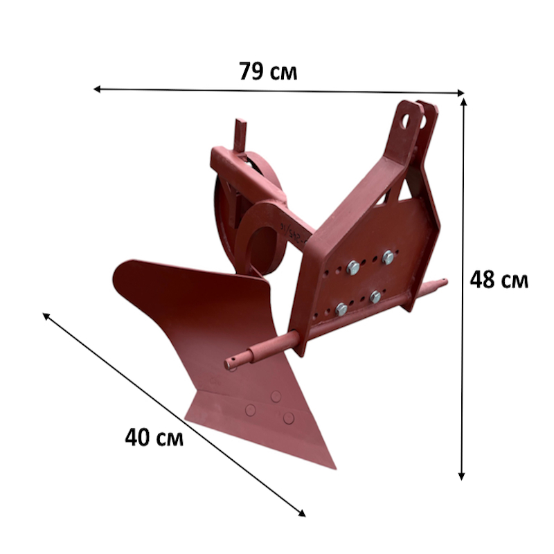 Плуг оснащен одним корпусом и рассчитан на работу с тракторами мощностью от 13 л.с., обеспечивая производительность до 0,12 га/ч при рабочей скорости 5 км/ч. При габаритах (79x40x48 см) и весе в 30 кг, плуг легко транспортировать и использовать даже на ограниченных участках.