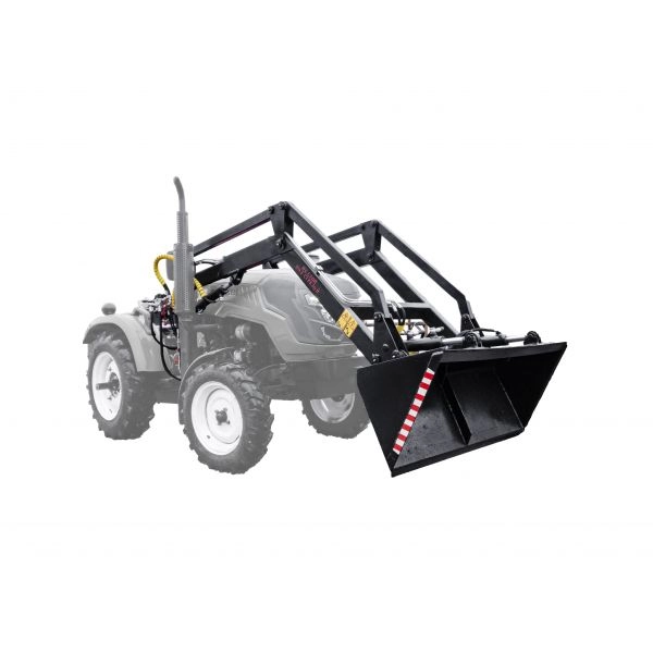 Ковш объемом 0,23 м? и шириной 150 см позволяет удобно маневрировать на строительных и сельскохозяйственных объектах. Глубина опускания составляет 450 мм, обеспечивая точную работу при погрузке. Погрузчик крепится спереди, что гарантирует удобство эксплуатации и хороший обзор для оператора.