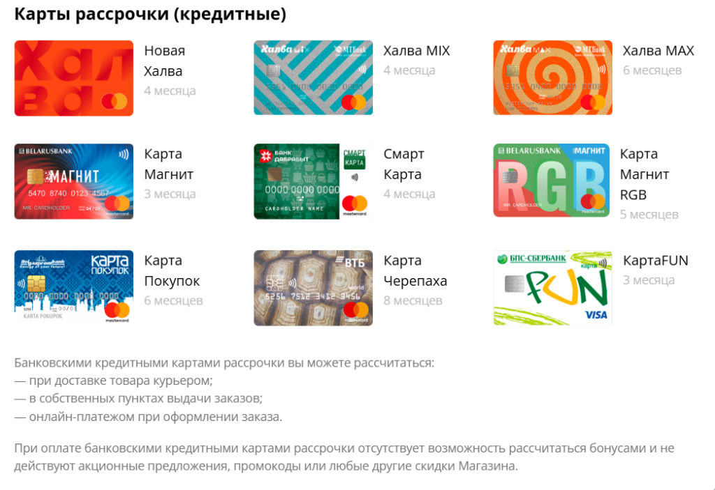 Возможность приобретения товаров по банковским кредитным картам рассрочки на сайте показана следующим образом: